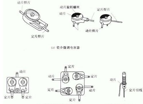 微調電容器是由兩極片間夾有絕緣介質組成的,絕緣介質通常用云母片或有機薄膜。絕緣介質微調電容器則是在兩個陶瓷體上鍍銀制成的。調節兩金屬極片間的距離或改變它們的交疊角度即可改變它們的電容量。還有一種微調電容器,它由內部引線和纏繞在絕緣介質上的導線構成電容器.電容量的改變是靠拆去繞線的圈數來實現的。這種微調電容器又稱為拉線式微調電容器。圖4-109 給出了一些微調電容器的外形圖。