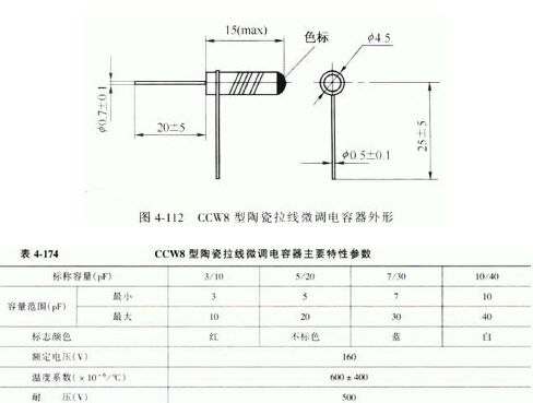 CCW8 型陶瓷拉線微調電容器是靠拆去外電極繞線來變動電容量的,它只能向電容減小的方向調整,故一般適用于振蕩頻率不需要經常變動的振蕩電路中。其外形如圖4-112 所示,主要特性參數見表4-174。