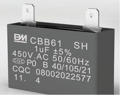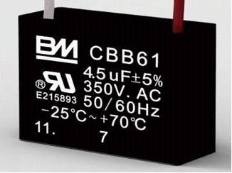 BM:我們的商標。 CBB61:金屬化聚丙烯薄膜電容,方形。 4.5uF:電容器的容量。 ±5%:電容器的容差是正負百分之五。 350V.AC:電容器的使用電壓,350V交流。 50/60Hz:使用電壓的頻率是50或60。 -25℃~+70℃:電容器的使用溫度是負25度到正70度。 11.7:電容器生產的日期,2011年7月。 :UL認證標志,下面的數字是BM電容UL認證的證書編號。