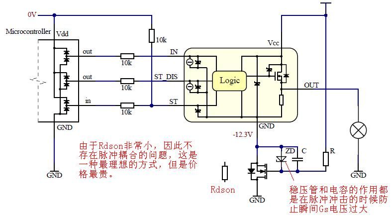高成本,額外的器件多,穩(wěn)壓管和電容都是為了防止瞬間GS電壓過大。