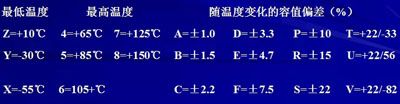 根據美國標準EIA-198-D,在用字母或數字表示陶瓷電容器的溫度性質有三部分:第一部分為(例如字母X)最低工作溫度;第二位部分有效數字為最高工作溫度;第三部分為隨溫度變化的容差(以ppm/℃表示)。這三部分的字母與數字所表達的意義如表。