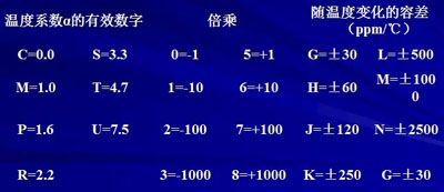根據美國標準EIA-198-D,在用字母或數字表示陶瓷電容器的溫度性質有三部分:第一部分為(例如字母C)溫度系數α的有效數字;第二位部分有效數字的倍乘(如0即為100);第三部分為隨溫度變化的容差(以ppm/℃表示)。這三部分的字母與數字所表達的意義如表。