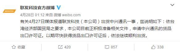 美國封殺中興通訊后,外傳經濟部國貿局也要求聯發科對中興通訊停售芯片;聯發科28日凌晨在官微緊急發文表示,依臺灣經濟主管部門要求,正積極準備相關文件,申請中興的貨品出口許可證,以期盡快獲得貨品出口許可證后繼續順利出貨。