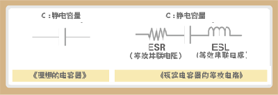 理想的電容器是只有靜電容量的元件,但現實中,其還擁有因電極帶來的電阻成分與電感成分。電路圖中無法標識的電阻成分稱為ESR(等效串聯電阻)、電感成分稱為ESL(等效串聯電感)。