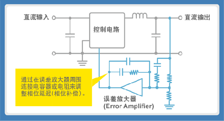 因此,為減少相位延遲,通過在誤差放大器周圍連接電容器或電阻來去除相位延遲進行調整。這種方法稱為相位補償。在輸出電容器中,以往使用ESR較高的鋁電解電容器的設計中不會產生問題,但ESR較低的MLCC會發生補償不足,從而會引起異常振動,因此在更換時需要注意。