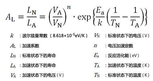 下面的加速公式是基于阿列紐斯法,利用電壓加速系數(shù)(※1)及反應(yīng)活化能(※2)推算。