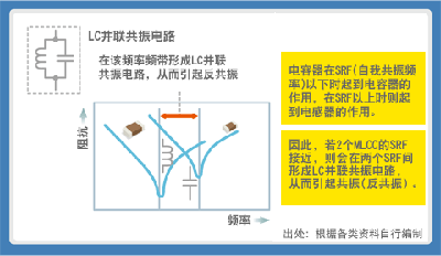 因此,若2個MLCC的SRF(自我共振頻率)接近,則會形成電感器與電容器的LC并聯諧振電路,從而容易發生振動。這就是反共振現象。