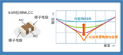 TDK自行開發的全新ESR控制MLCC具有很好的效果。該電容器擁有與三端子貫穿型電容器相似的結構,其特點在于,通過與多個內部電極模式之間的組合改變積層體內的導體電阻值,實現將ESR設計為任意值。從而可實現在無需改變芯片尺寸、靜電容量與耐電壓等的情況下對ESR值進行更改的產品。